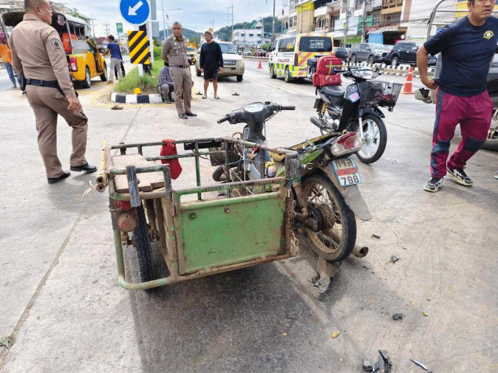 ใกล้กันพบรถจักรยานยนต์พ่วงข้าง ไม่ติดแผ่นป้ายทะเบียน ถูกเฉี่ยวชนจนพังเสียหาย ทำให้มีผู้บาดเจ็บอีก 1 ราย รวมมีผู้ได้รับบาดเจ็บทั้งหมด 2 ราย เจ้าหน้าที่กู้ภัยเร่งให้การช่วยเหลือและนำส่งโรงพยาบาล