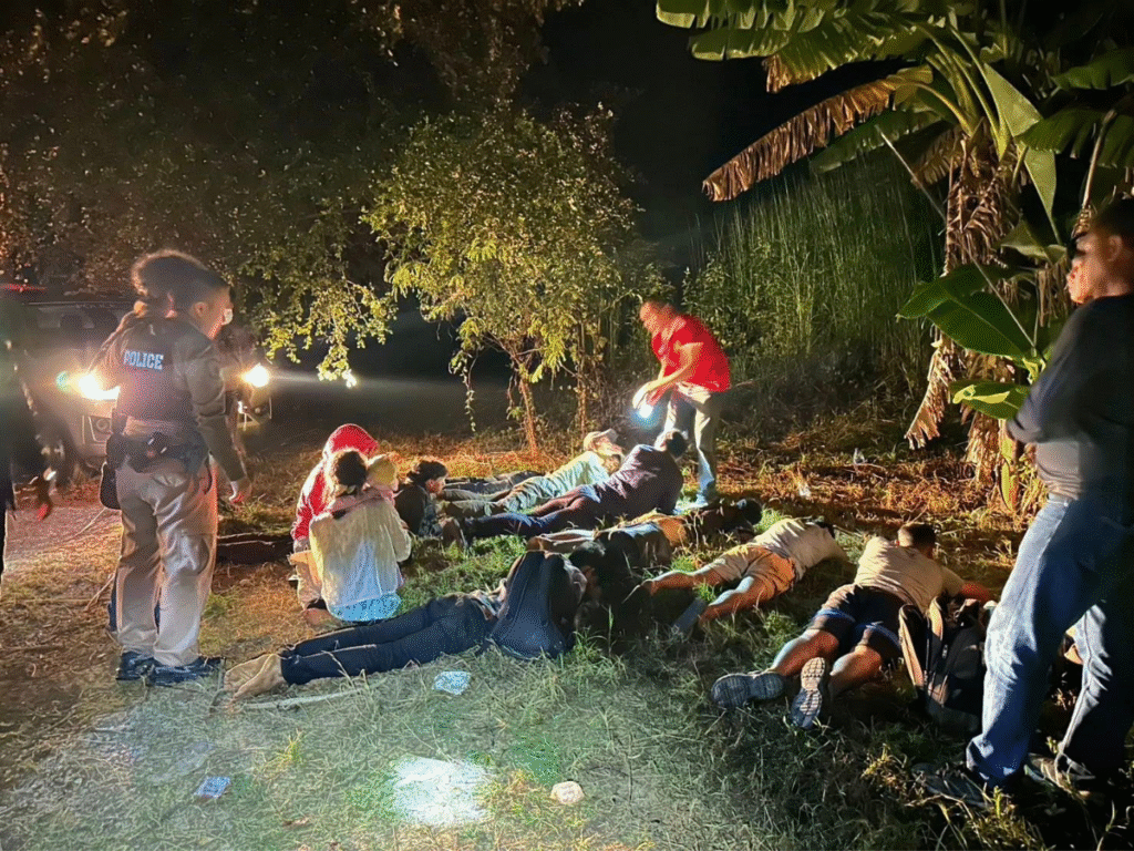 เมื่อเจ้าหน้าที่เดินทางไปถึงจุดเกิดเหตุ ซึ่งเป็นพื้นที่ป่าหญ้าคาท้ายหมู่บ้าน พบกลุ่มชายหญิงต่างชาติจำนวนมากกำลังนั่งและนอนซ่อนตัวอยู่ จึงได้เข้าตรวจสอบและควบคุมตัวทั้งหมดไว้ พบว่าเป็น ชาวเมียนมา 15 คน และชาวจีน 5 คน รวม 20 คน