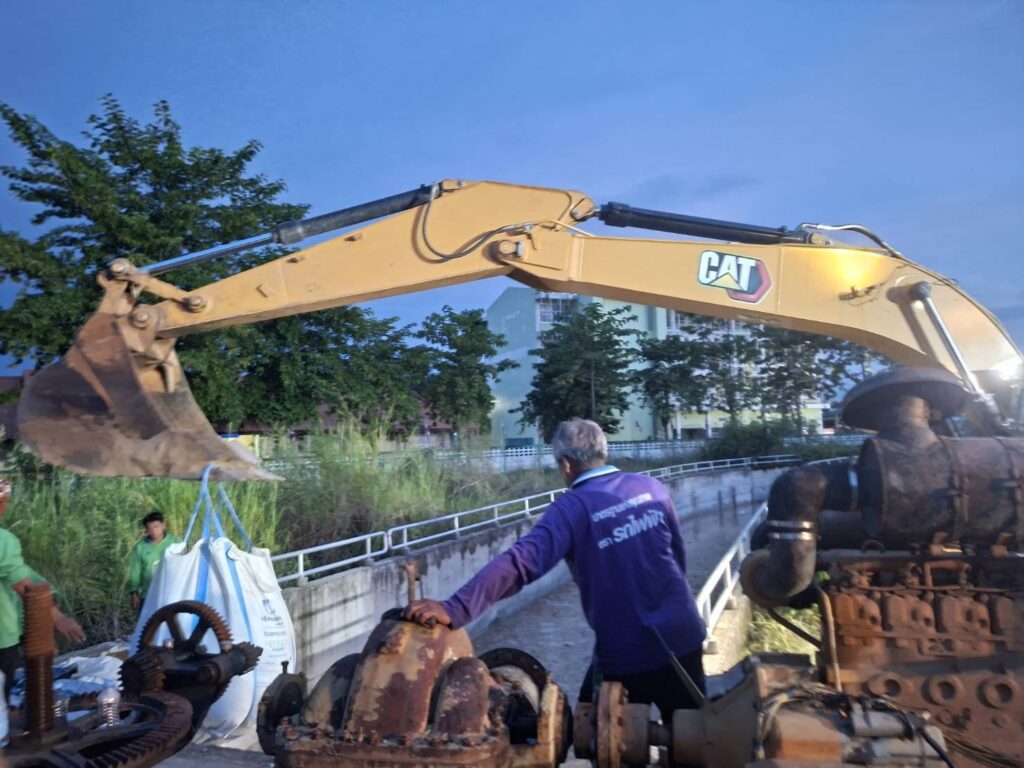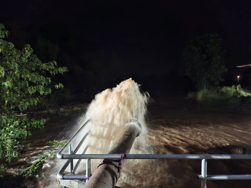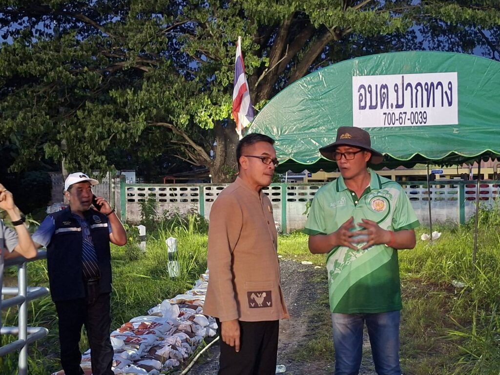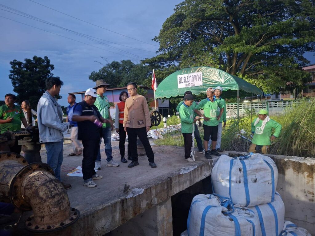 การป้องกันเบื้องต้น เจ้าหน้าที่ได้ติดตั้งเครื่องสูบน้ำเพื่อเร่งระบายน้ำอย่างต่อเนื่อง และนำถุง BigBag วางปิดกั้นตามแนวประตูระบายน้ำเพื่อป้องกันน้ำทะลักเข้าสู่เขตเศรษฐกิจ