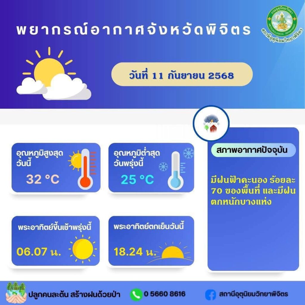 กรมอุตุนิยมวิทยารายงานว่า วันนี้จังหวัดพิจิตรมีฝนฟ้าคะนอง ร้อยละ 70 ของพื้นที่ และมีฝนตกหนักบางแห่ง