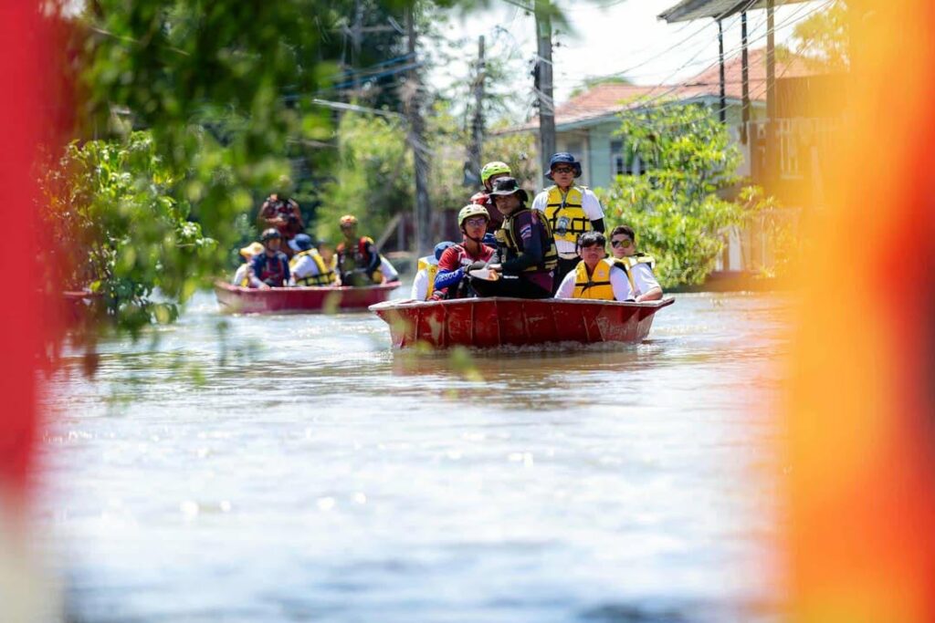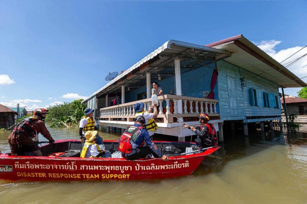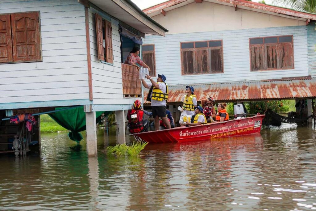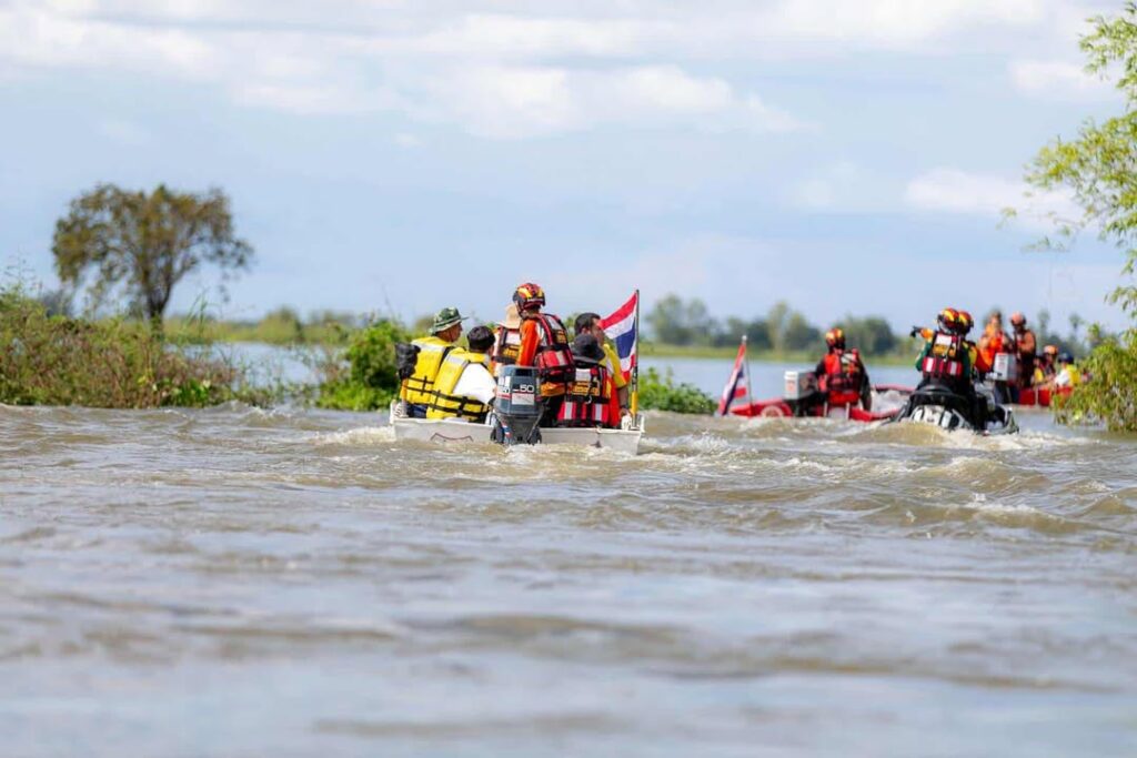 โดยเจ้าหน้าที่และอาสาสมัครได้ใช้เรือฝ่ากระแสน้ำระยะทางกว่า 5 กิโลเมตร เพื่อนำน้ำดื่มและอาหารไปส่งมอบให้ถึงมือผู้ประสบภัยในแต่ละครัวเรือน ซึ่งหลายบ้านยังถูกน้ำท่วมสูงจนไม่สามารถออกจากพื้นที่ได้