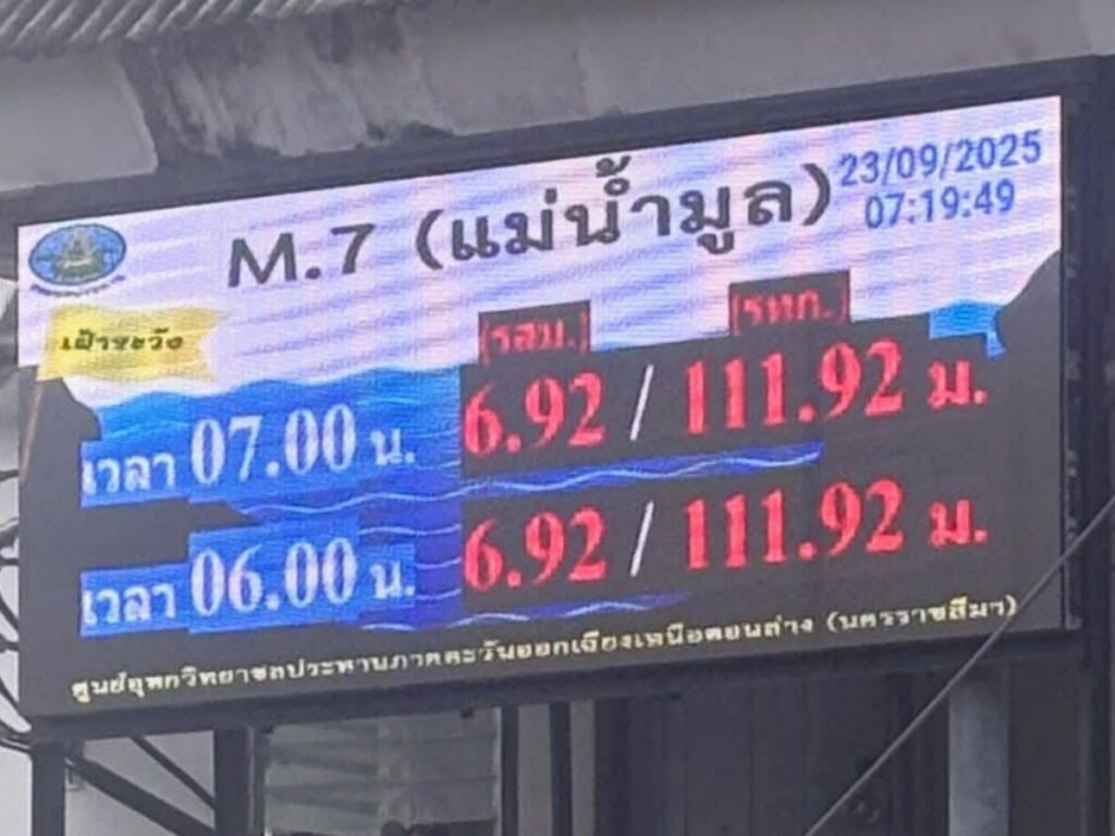 เช้าวันที่ 23 กันยายน 2568 รายงานสถานการณ์น้ำจากสถานีวัดน้ำ M7 ระบุว่าระดับน้ำเพิ่มจากเมื่อวานที่ 111.83 ม.รทก. ขึ้นมาอยู่ที่ 111.92 ม.รทก. หรือเพิ่มขึ้นอีก 11 เซนติเมตร ขณะนี้เหลือระยะห่างเพียง 8 เซนติเมตรก็จะเข้าสู่ระดับวิกฤต “ธงแดง” ซึ่งถือเป็นสัญญาณเตือนภัยน้ำท่วม